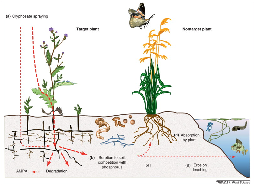 Grafika przedstawia w jaki sposób glifosat ze środka Roundup przedostaje się organizmu.