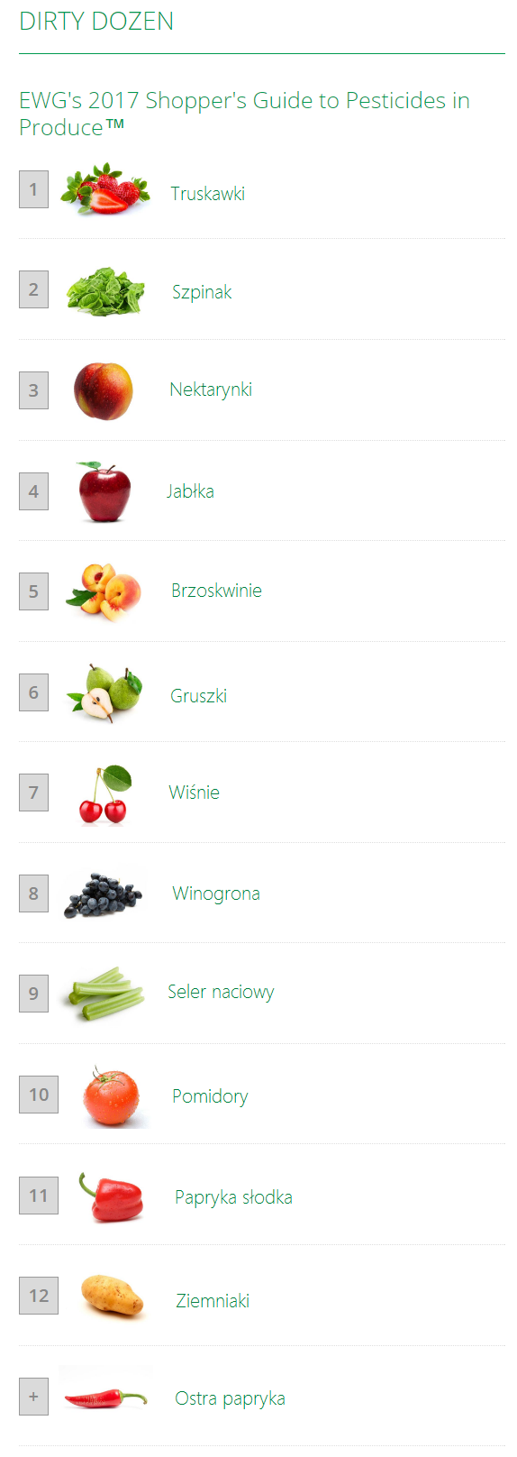 Lista owoców i warzyw, które posiadały najwiecej pestycydów i pozostałosci po nich: „Brudna Dwunastka” – Dirty Dozen